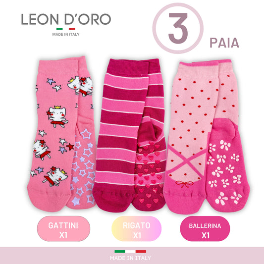 Calzini Bambina Antiscivolo Cotone 3 Paia Calze Bimba abs scuola casa gonfiabili, Made in Italy ASS4