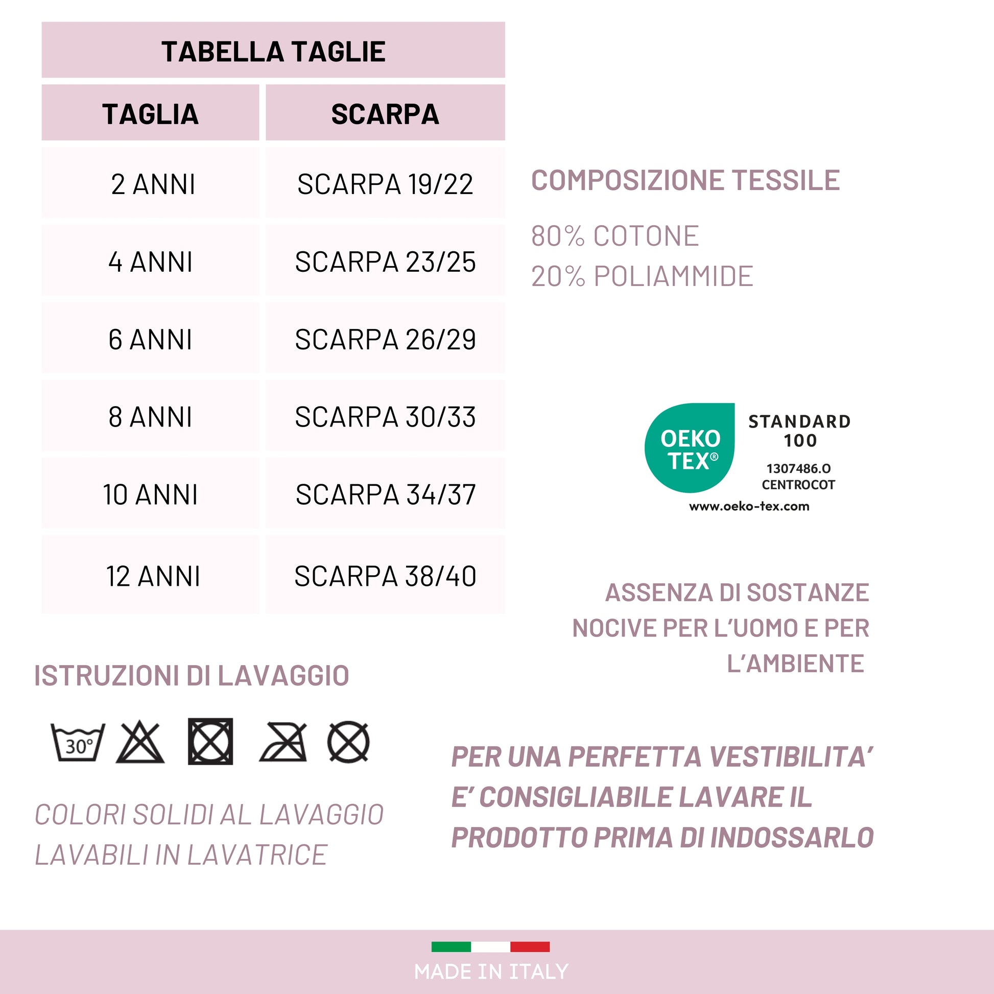 Lavabilità: Lavare le calze prima dell'utilizzo per ottenere la vestibilità perfetta così facendo il tessuto ha il rientro dato dal lavaggio e la calza non si presenta più lunga. Le calze per bambina le puoi lavare a 40° hanno un' asciugatura rapida. Ti consigliamo per il mantenimento della qualità di non mettere in asciugatrice, non candeggiare, non lavare a secco e non stirare. Per una corretta conservazione del prodotto segui le nostre indicazioni.