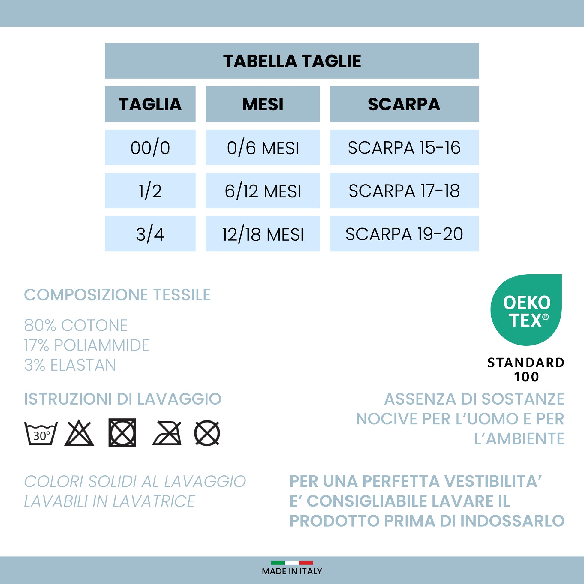 - Lavabilità: Lavare le calze prima dell'utilizzo per ottenere la vestibilità perfetta così facendo il tessuto ha il rientro dato dal lavaggio e la calza non si presenta più lunga. Le calze per neonato le puoi lavare a 40° hanno un' asciugatura rapida. Ti consigliamo per il mantenimento della qualità di non mettere in asciugatrice, non candeggiare, non lavare a secco e non stirare. Per una corretta conservazione del prodotto segui le nostre indicazioni.