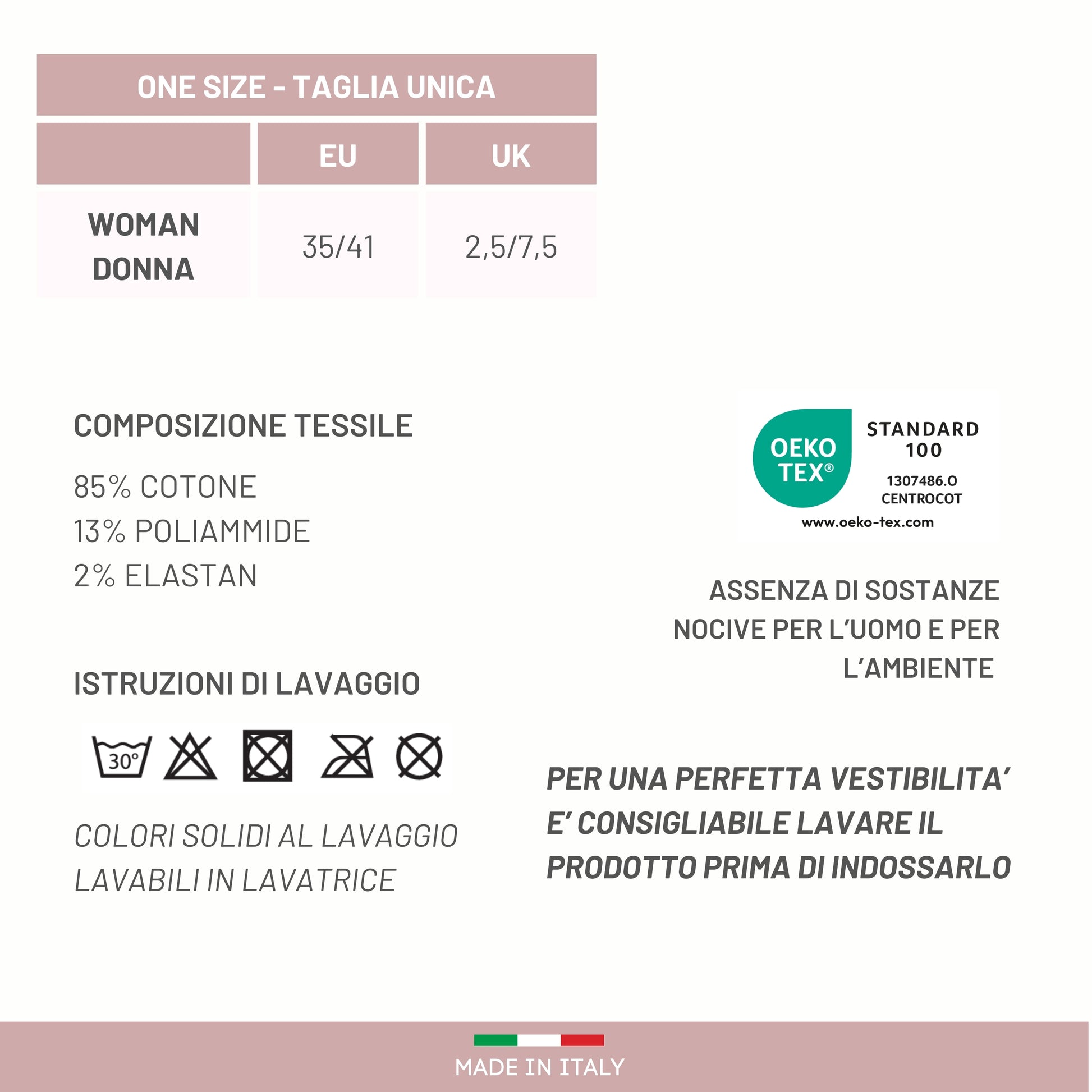 - Lavabilità:Lavare la calza proma dell'utilizzo per ottenere la vestibilità perfetta così facendo il tessuto ha il rientro dato dal lavaggio e la calza non si presenta più lunga. Le calze sanitarie per diabetici le puoi lavare a 40° hanno un' asciugatura rapida. Ti consigliamo per il mantenimento della qualità di non mettere in asciugatrice, non candeggiare, non lavare a secco e non stirare. Per una corretta conservazione del prodotto segui le nostre indicazioni.