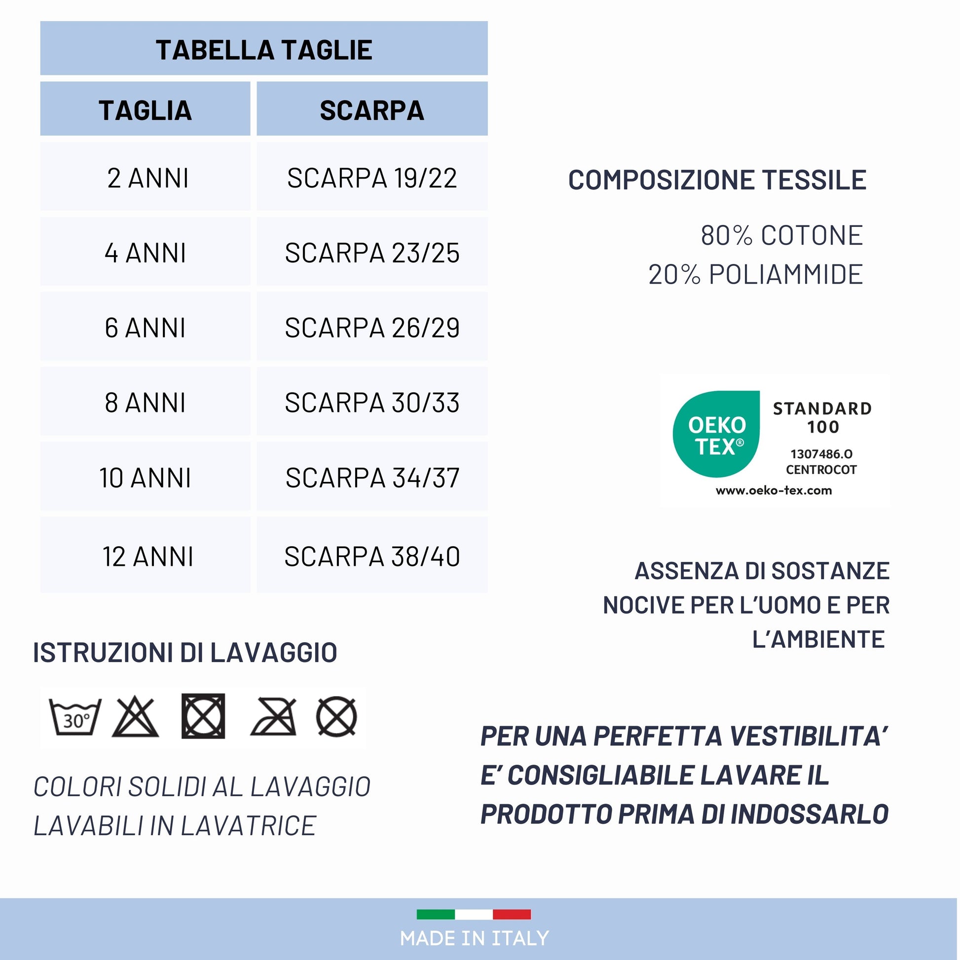 Lavabilità: Lavare le calze prima dell'utilizzo per ottenere la vestibilità perfetta così facendo il tessuto ha il rientro dato dal lavaggio e la calza non si presenta più lunga. Le calze per neonato le puoi lavare a 40° hanno un' asciugatura rapida. Ti consigliamo per il mantenimento della qualità di non mettere in asciugatrice, non candeggiare, non lavare a secco e non stirare. Per una corretta conservazione del prodotto segui le nostre indicazioni.